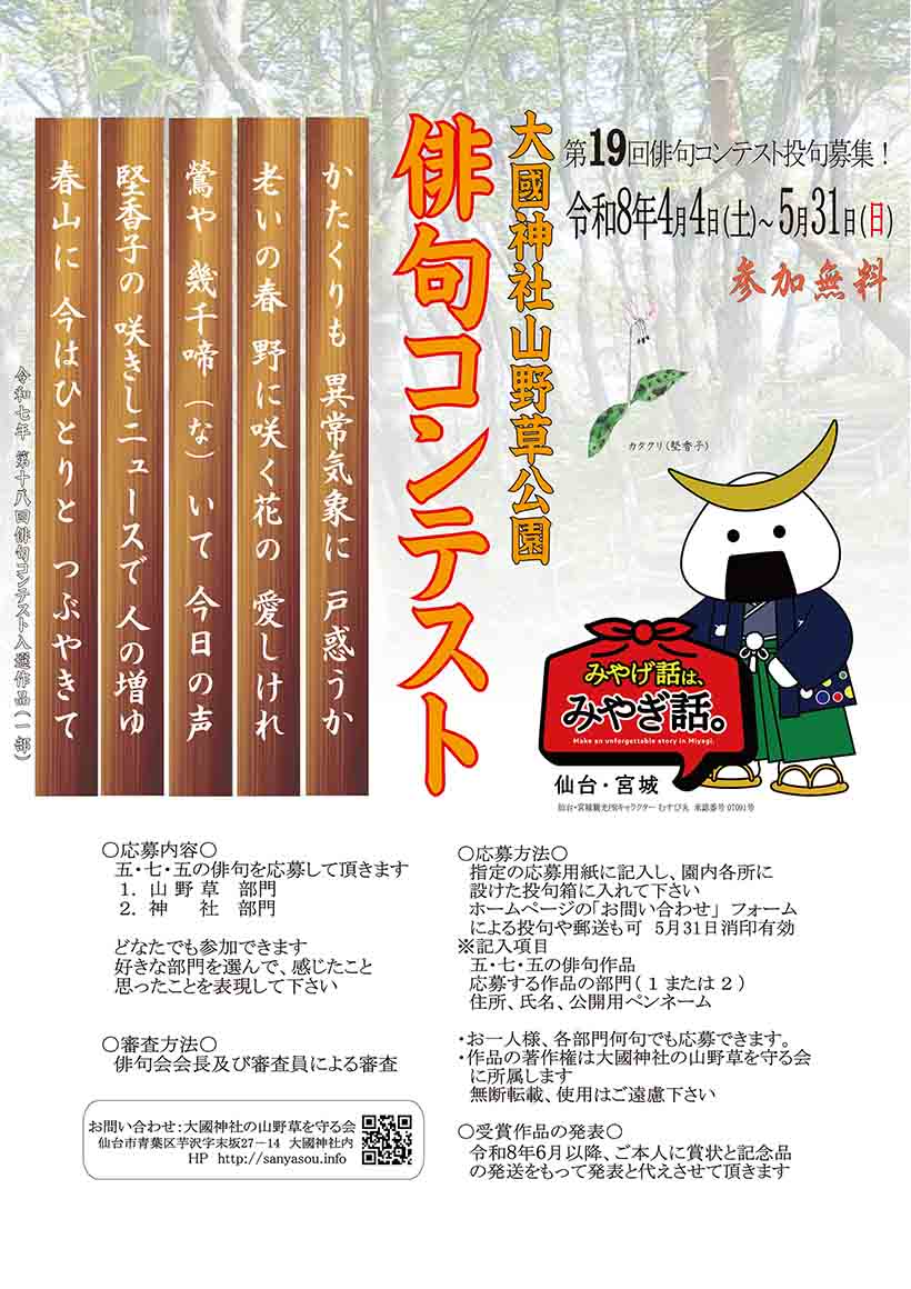 ◎天 かたくりも 異常気象に 戸惑うか 助さん ◎地 老いの春 野に咲く花の 愛しけれ 兎十夢 ◎人 鶯や 幾千啼(な)いて 今日の声 兎十夢 入選 堅香子の 咲きしニュースで 人の増ゆ 田中偉郎 ぜんまいや 朴葉突き抜け 巻きをりし 田中偉郎 春山に 今はひとりと つぶやきて 海和 榮子 詠み人を 想う早春 いずこなり 助さん 皆様おめでとう御座います! 入選者には賞状と記念品をお送り致しますので、暫しお待ちください。 |